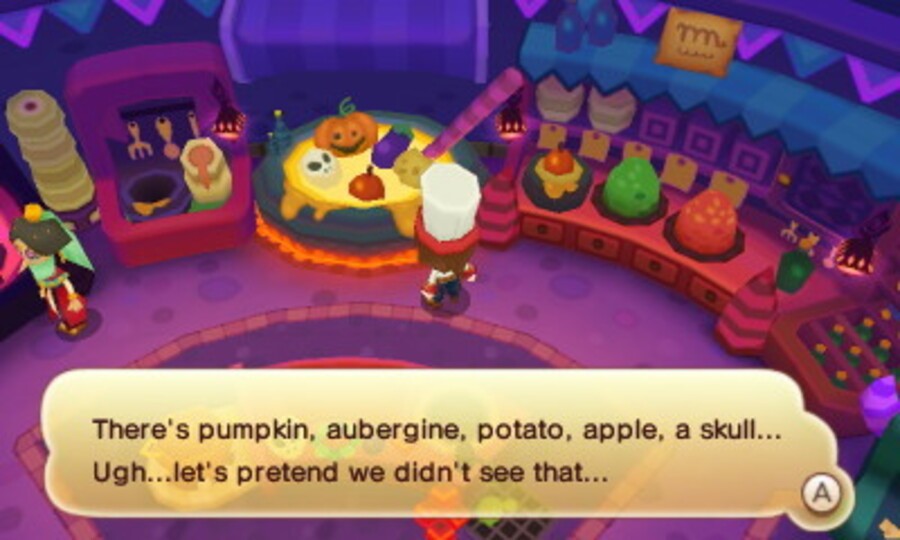 Life master and chief illuminatus Alfredo seems very dismissive of me when I arrive — they obviously don't allow just anyone into their secret society. Alfredo hands me a toy frying pan and mentions how the last recruit badly messed up his first dish and is now banned from the kitchen forever. Not only is Alfredo a genius criminal mastermind, he's also an artiste. Sizzle is Alfredo’s plushling sous chef who falters when trying to remember the test dish used to weed out new recruits, thereby honouring their code of silence until what I’m sure is a hand signal gets passed between himself and Alfredo, and the plushling suddenly tells me to make carrot soup. I reach for the weeks-old carroty corpse in my apron’s pocket when Sizzle says he’ll take me to get the freshest ingredients possible. I don’t know if ‘fresh ingredients’ means ‘a long walk on a short pier in cement low-top shoes,’ but as a career mute I’ve accepted that I’ll never get the hang of code phrases or neurolinguistic programming. As we make our way to South Castele to talk to Giles the farmer about some vegetables Sizzle asks me if I've gotten used to how he speaks, but I'm not sure if he meant his constant use of the third person when referring to himself or the fact that every syllable he utters seems to point to something larger and more sinister than mere first courses.