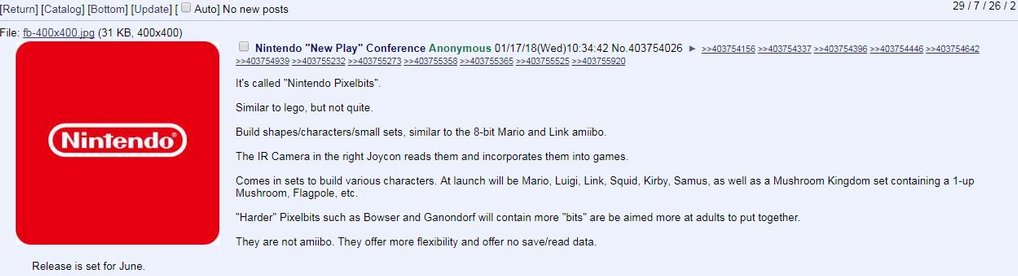 My guess is that it'll be a series of toys--like Lego or similar--that interact with a new Switch game. Not Amiibo, necessarily, but something that uses both NFC communication and Bluetooth connectivity that causes actions to take place in a game and reactions in the toy itself.