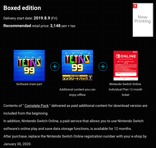 The listing shows a 'boxed edition' which is scheduled to release on 9th August for 3,148 yen before tax (approx. $29 / £23). It includes the main software, "additional content" which can be played offline - which we would assume is the $9.99 Big Block DLC, and a 12-month subscription to Nintendo Switch Online.