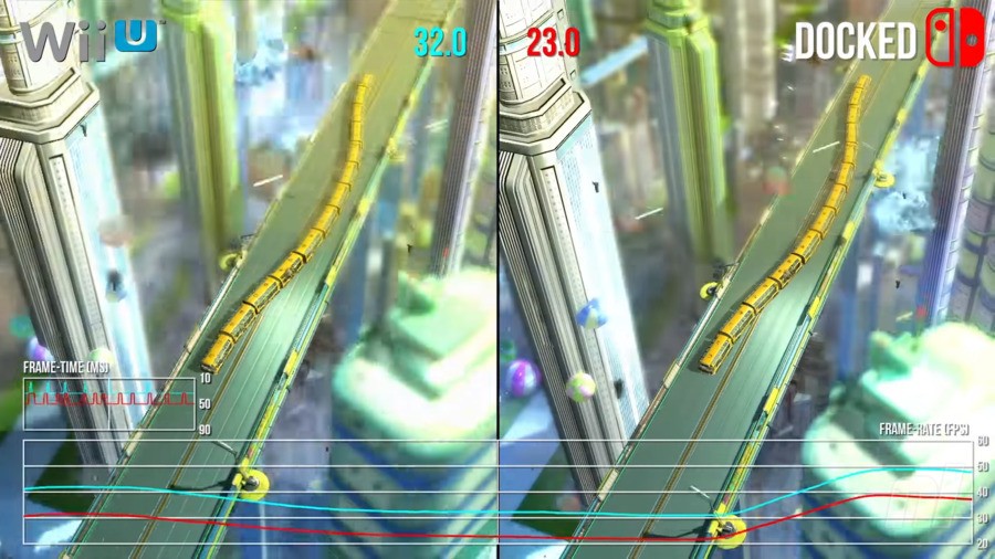 The gap between Wii U and Switch closes in gameplay at least, but the fact that performance is still an issue at all is disappointing. Meanwhile, the results in portable play at least improve on docked play by a margin of up to 5fps. The native output is a less demanding 720p, which helps boost the frame-rate in action with lots of transparencies - despite the huge drop in GPU core clock and memory bandwidth. It's telling that the game still hits the same 23fps low point as docked play during the top-down view of the city, which suggests that processing so much geometry triggers a CPU bottleneck - rather than GPU. Portable play is broadly in the same space performance-wise then, but expect moments to run a touch faster.