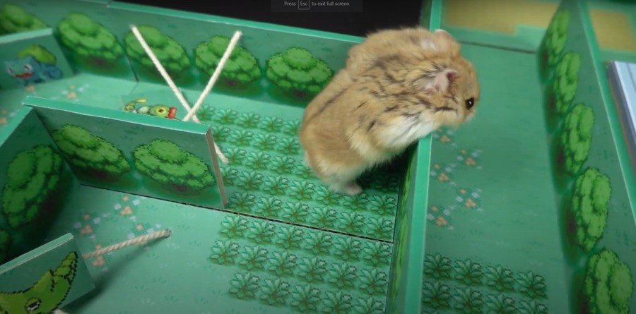 The newest maze is based on the Pokémon games, and it took a month to build. Not only does the hamster have to make its way from the starting town, through caves and long grass, to the final fight with Team Rocket's Giovanni, but it also has to fight Pokémon along the way. Some of those Pokémon are just standing around, waiting to be knocked over, but others - presumably controlled by the hamster's owner - are more forceful, nudging the little guy towards the next area.