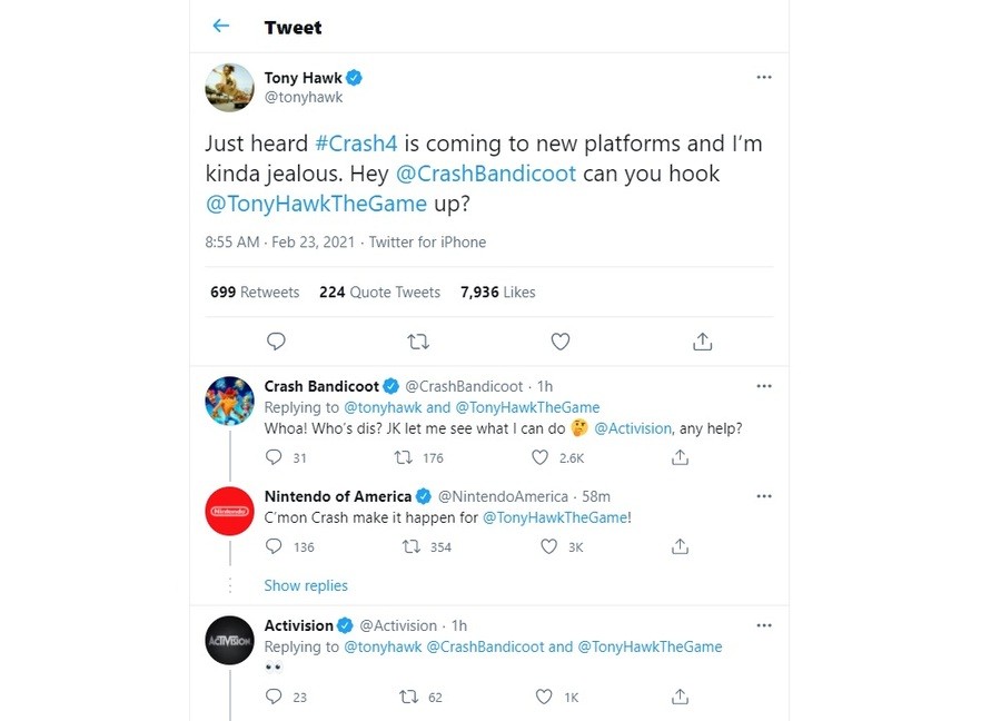 Nintendo of America took note retweeting Tony's comment and then the Activision and Crash Bandicoot Twitter account joined in on the fun. It's worth noting the Switch is the only console platform the new Tony Hawk game isn't on yet.