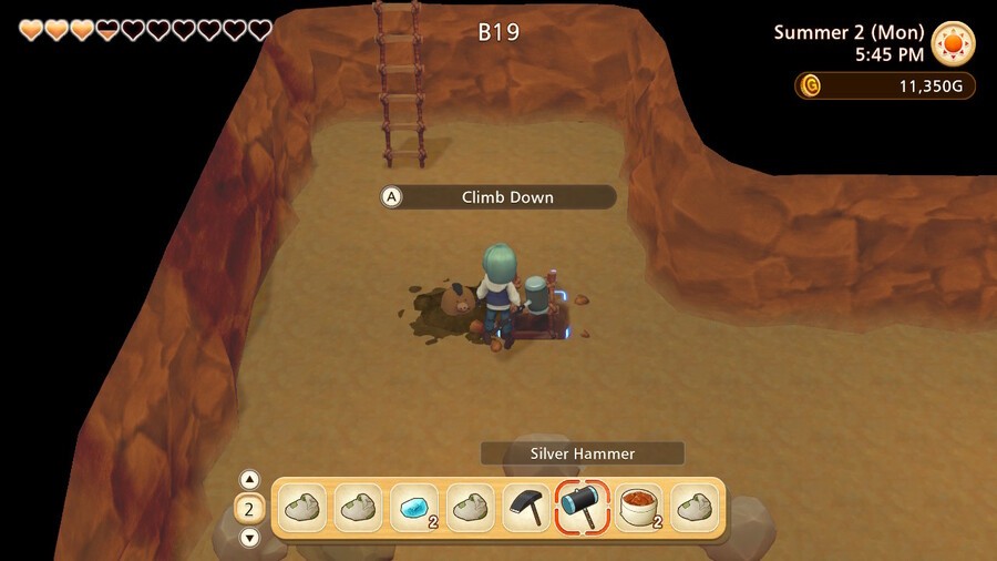 The mine is often one of the best parts of Story of Seasons games, and this one doesn't disappoint so far, with stamina-draining moles that you have to bonk on the head with a hammer. It seems like there are different mines with rarer ores and minerals, and so far we've only unlocked the one with iron and opal, and the one with silver and rubies. We've even found a couple of diamonds! We know that gold exists, because the next tool upgrade requires it, but that mine is locked away behind a bunch of debris that we have to remove with either money or materials - an option that's quite nice to have.