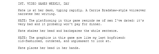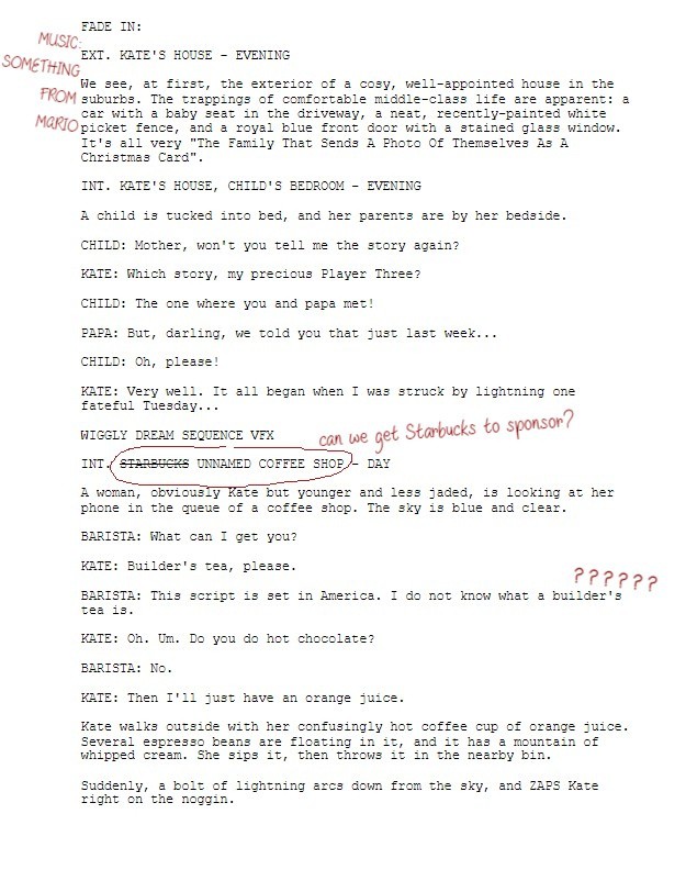 In the magazine business, the Back Page is where you'd find all the weird goofs that we couldn't fit into the rest of the pages. Some may call it "filler"; we prefer "a whole page to make terrible jokes that are tangentially related to the content of the mag". We don't have pages on the internet, but we still love terrible jokes - so welcome to our new regular feature, Back Page. This week, Kate snuck into Ubisoft's HQ, Ezio-style, and found a few pages of their latest script...