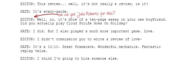 I was expecting some sort of take one the concept/script so now I’m just kinda confused about the entire idea overall 😂 like it sounds like she’s in a video game world having the job of a reviewer? Sounds wonky and confusing just by reading the script. I also find it ironic that one written note about it being too explicit when they used the terms “making love” and not sex and the portion above that was about her friend cheating on her spouse...