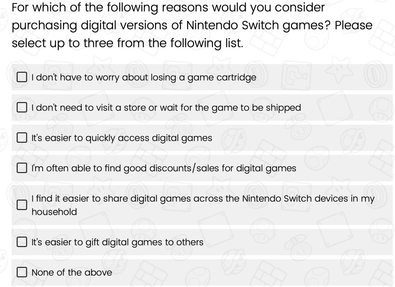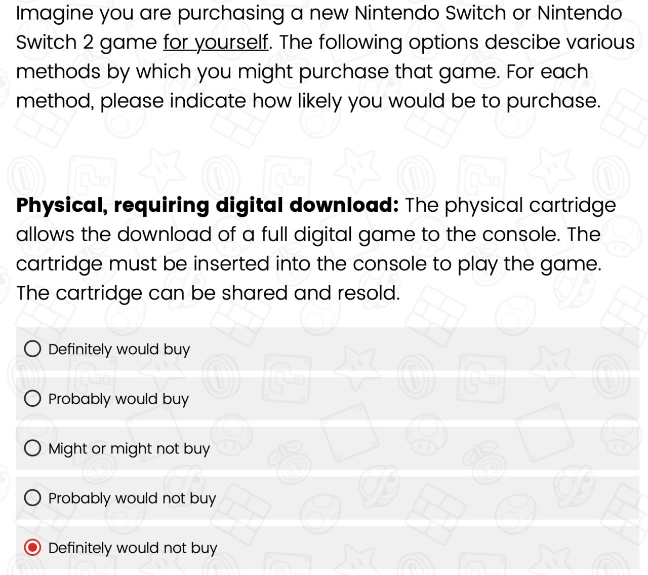 As you can see from our screens, they mostly want to know how strongly you feel about the physical game card actually having the game, whether or not you care about that, and how whether being in a store or buying online affects your thinking. Stuff like that, mate.