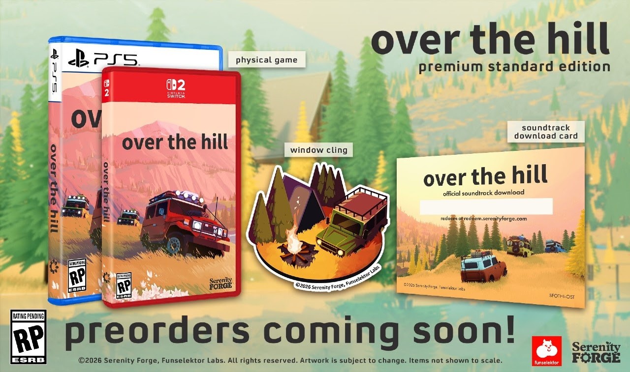 There's still no specific release date for over the hill just yet, though the end of the console announcement trailer reveals that pre-orders for a physical edition will be coming soon — the premium version of which comes packaged with a window cling and soundtrack download card.