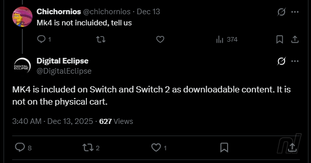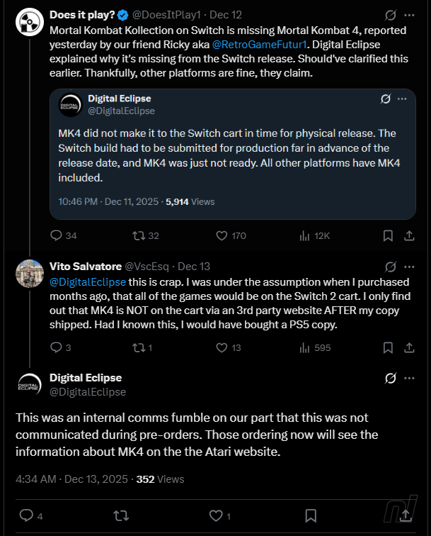 Digital Eclipse has also confirmed this only impacts the Nintendo versions of the game. The PlayStation 5 physical release contains every game in the Kollection on the disc. It also says if a future cartridge reprint happens for Switch platforms, it will supposedly include Mortal Kombat 4.