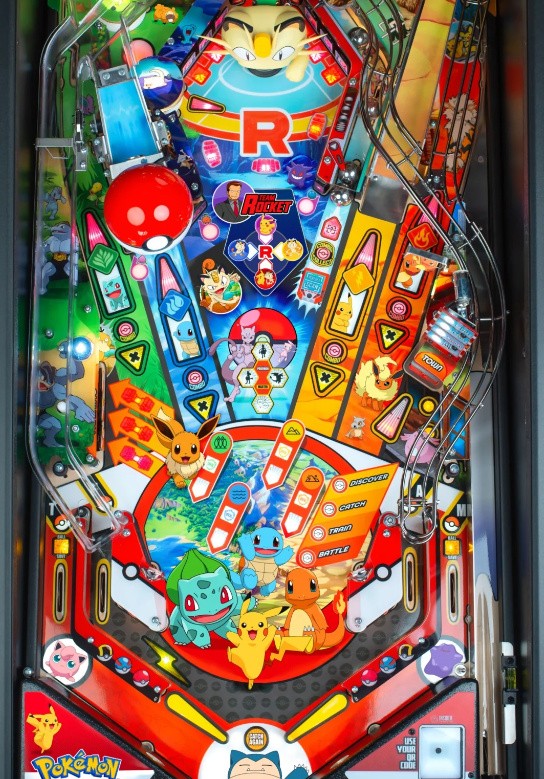 The game begins with the player entering a random biome: forest, water, mountain, or desert. By hitting the ball at the proper targets on the board, you’ll discover, catch, and train new Pokémon partners. Occasionally, you’ll encounter the troublesome Team Rocket, and you’ll need to prevent them from capturing Pokémon during a frantic multiball sequence.