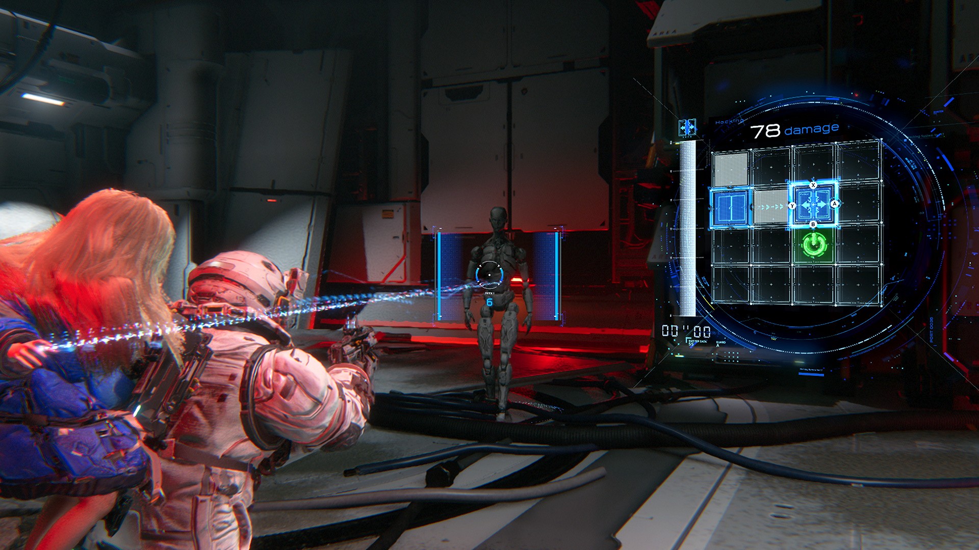 After a chance encounter, spacefarer Hugh Williams and android Diana make their way through a lunar research station as they look to escape and find their way back to Earth. Diana Hacks open enemy armor to create openings for Hugh to take down the enemy with his varied arsenal of firearms.