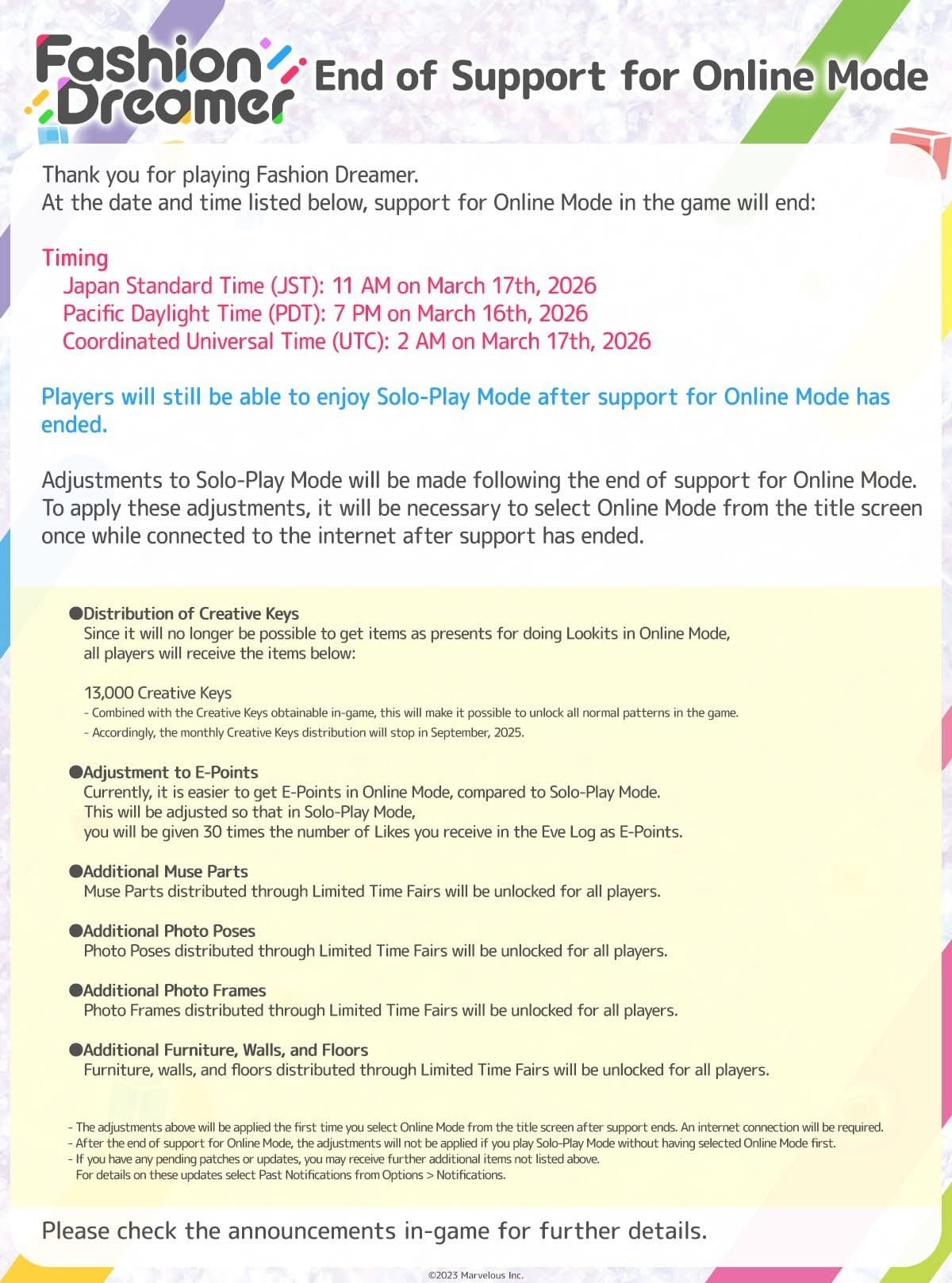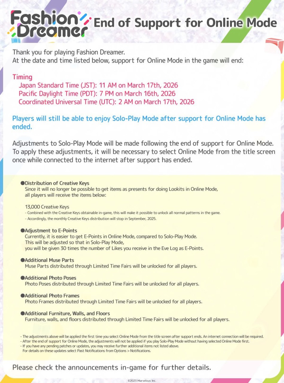 "Thank you for playing Fashion Dreamer. Support for Online Mode is scheduled to end on the following date: 17th of March, 2026 2AM UTC Solo-Play Mode will continue to be playable after Online Mode support ends."