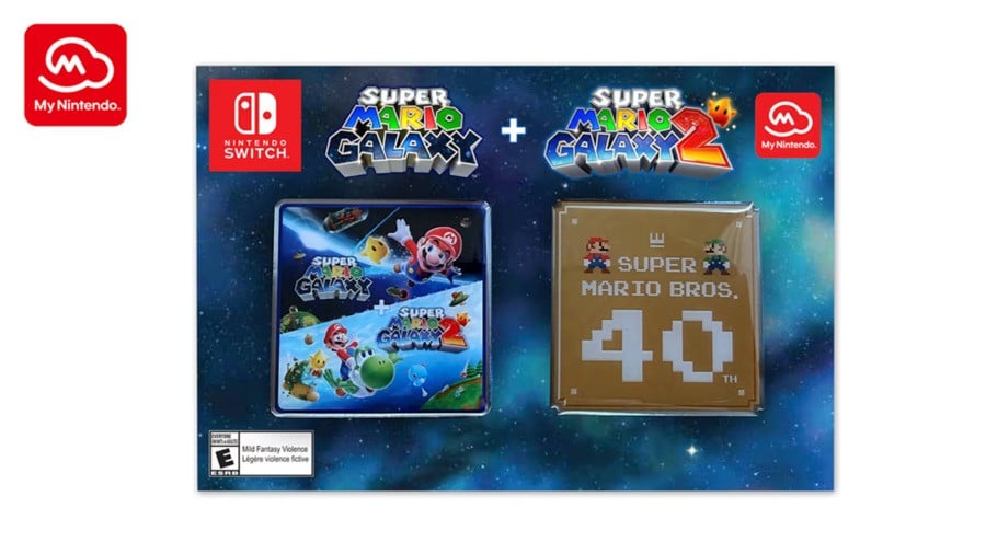 For 600 platinum points, you'll be able to get a Super Mario Galaxy + Super Mario Galaxy 2 pin that also comes with a 40th anniversary Super Mario Bros. pin. Here's another look, along with the official description and details: