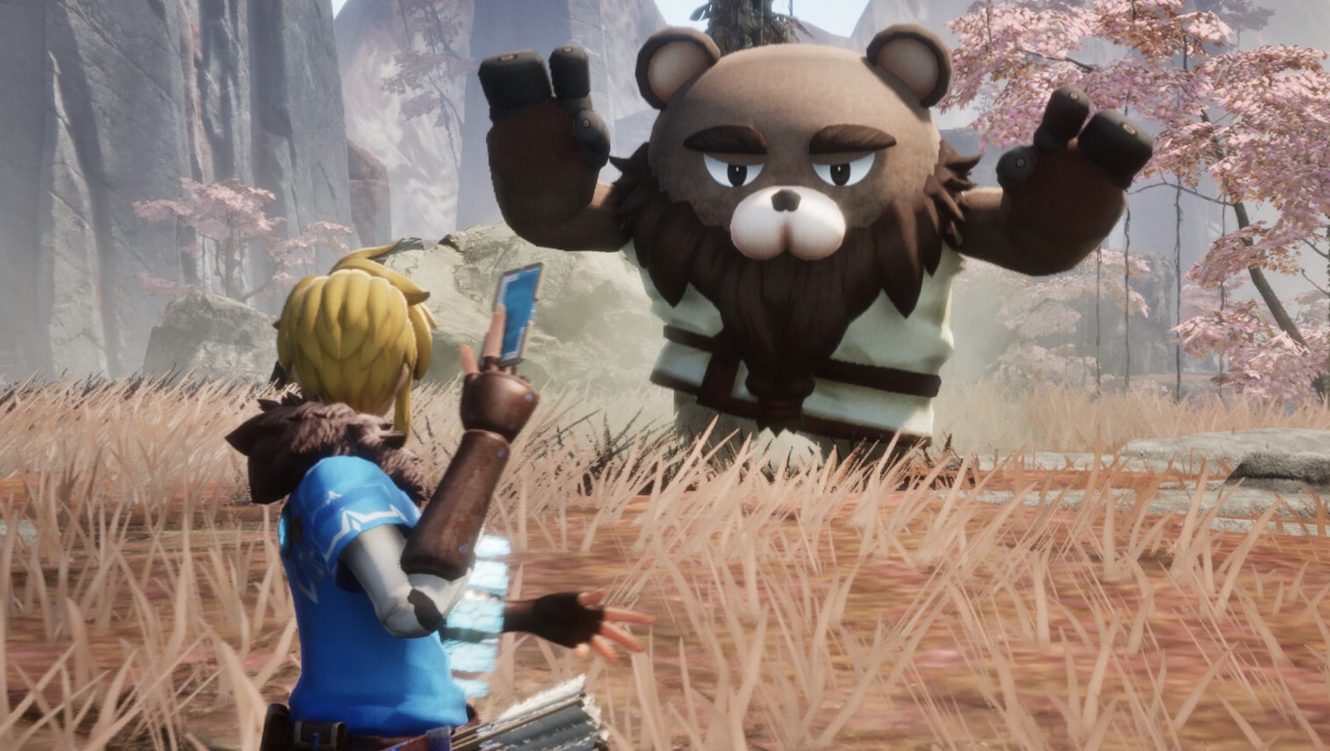 Let's start with the protagonist – do they remind you of anyone? Hopefully you did your best Churchill dog impression and nodded with an enthusiastic "ohh yes!", because Pickmon's protagonist is basically Link from Zelda: Breath of the Wild. The hair, the clothes... Next thing PocketGame will be telling us is that you start the game awakening from a 100-year slumber. At the very least, it looks like you'll spend a good deal of time traversing the world via a paraglider.