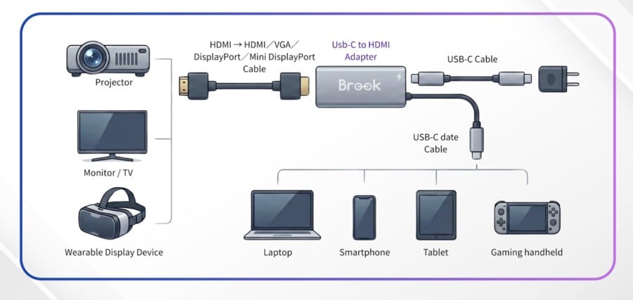 We've tested it out ourselves and can confirm that it hooks up to a 4K LG TV with no issues, but it will also work on devices like projectors. It goes without saying that you'll need to make sure you have an HDMI cable handy, while Brook also recommends you use the original Switch 2 AC adapter for power.