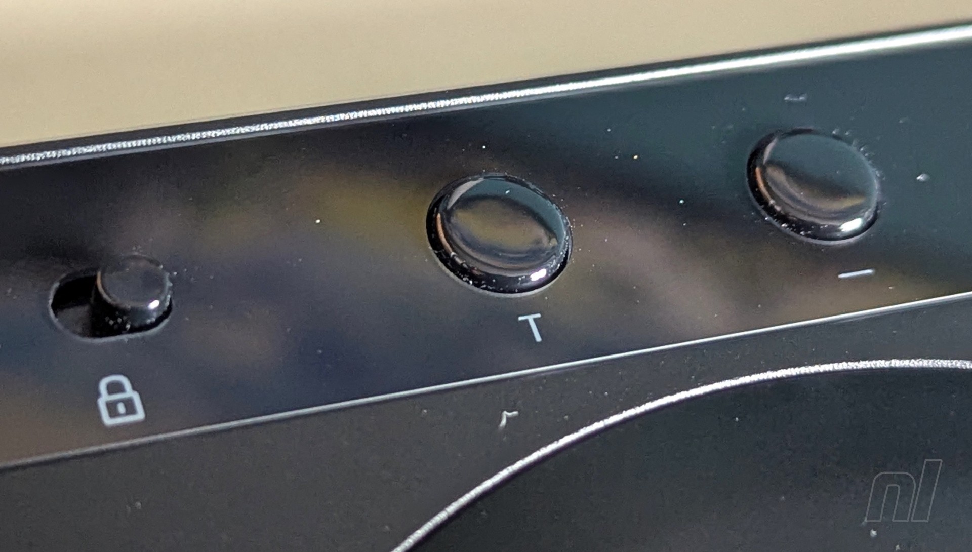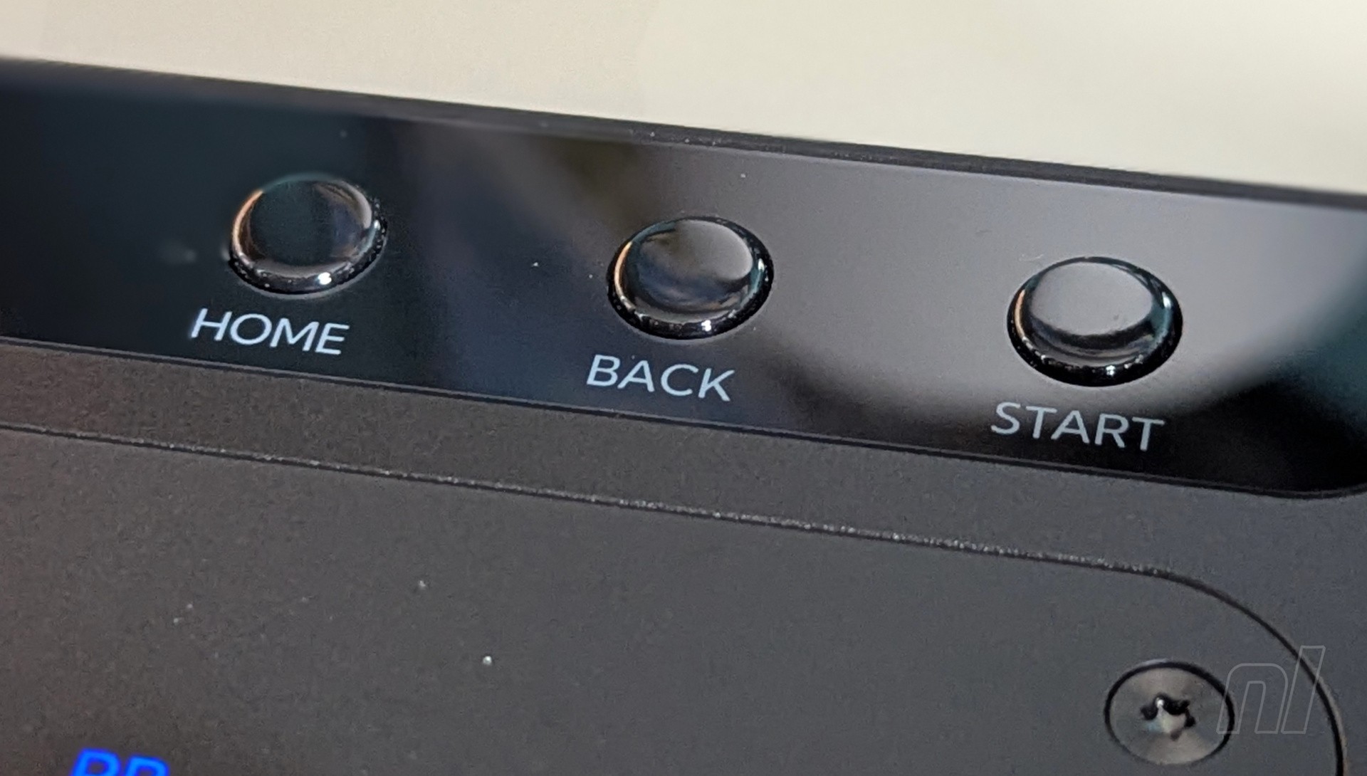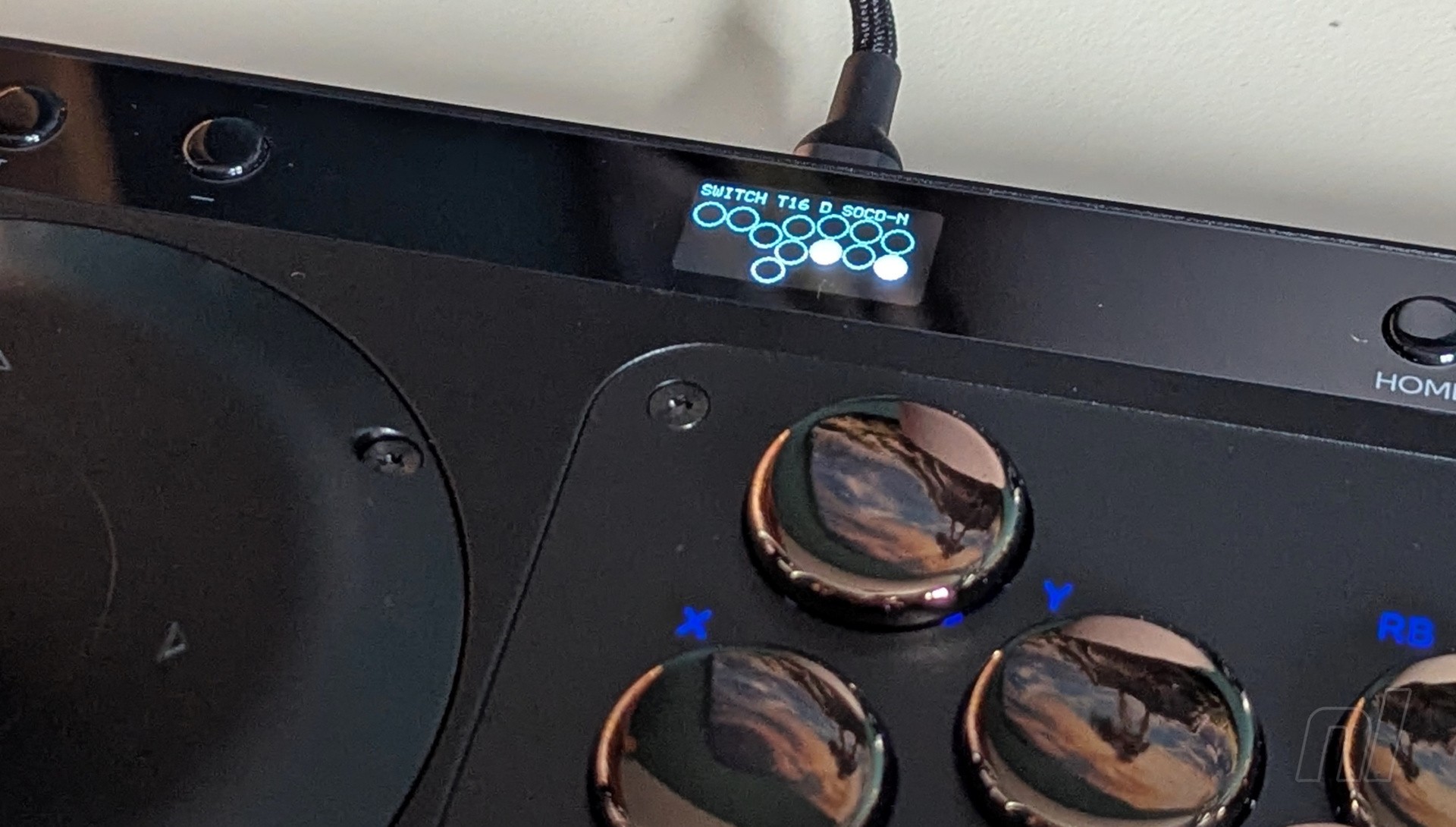 A function bar at the top contrasts the main body with a glossy finish, and contains the home button, +, –, back, and turbo (in Switch mode, '–' actually functions as the 'Capture' button). On the left, you’ll find a tournament lock toggle, while a small OLED screen is situated in the middle. This displays your button presses in real-time while also providing information on which profile you’re using along with any SOCD cleaning modes.