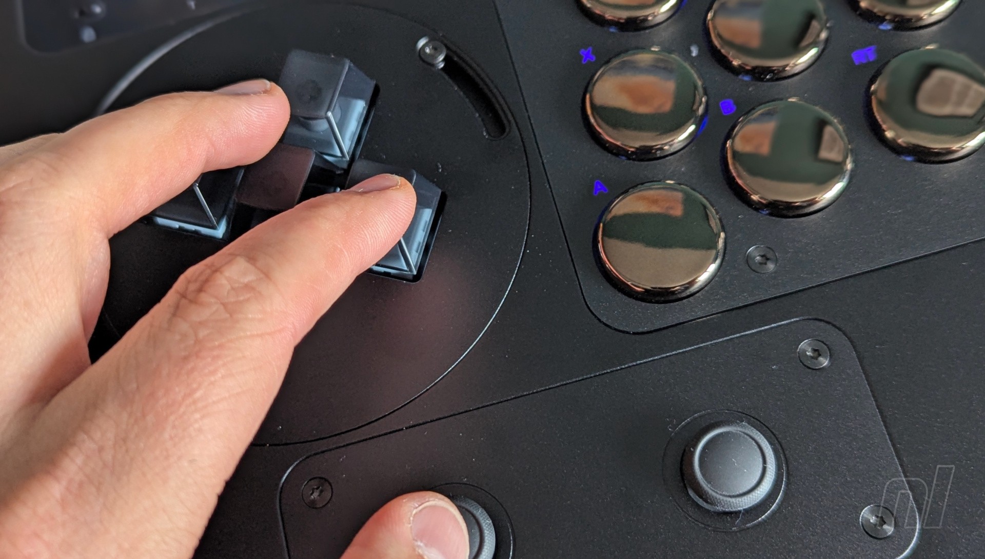 Now onto the modules. Starting with the left directional buttons, you can customise this with high-profile switches, low-profile switches, WASD keyboard switches, or a joystick. Excluding the joystick for a moment, the other three modules can also be angled up to 30° by loosening the two screws and turning the module while it’s in place. It’s worth just placing your fingers over the buttons and seeing what feels most comfortable, then simply angle the module accordingly.