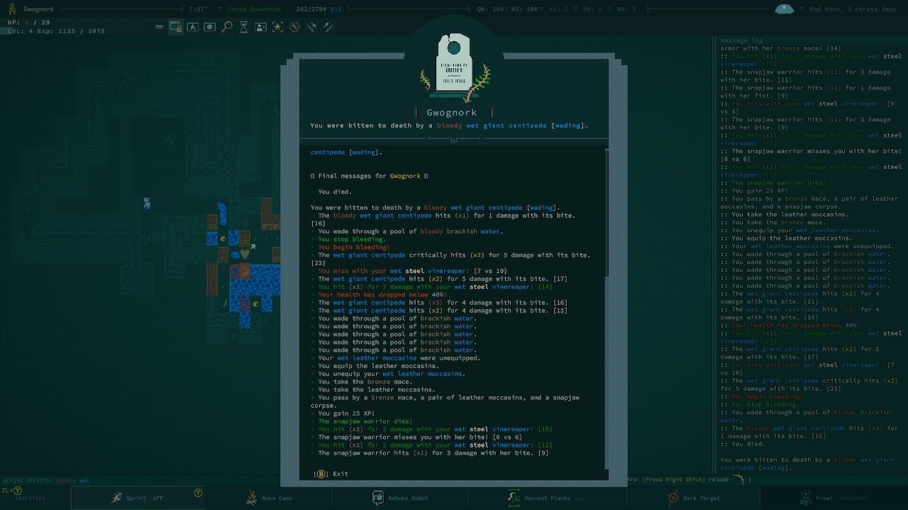 You won’t survive, though. My first achievement was collected by dying. It’s simply called “Welcome to Qud”. And this being a true roguelike, when you see “You died”, that’s your lot. No save points; no meta-progression: back to square one. It’s sad when your level-10 mutant croaks it after several hours’ play, but it’s also just part of their story. Qud is about making stories, and in that regard, it’s excellent.