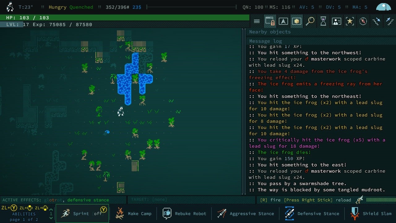 It’s true that this harks back to an era of astonishingly over-imaginative cover art and flickery ASCII graphics, but the effort to see the wonder in Caves of Qud is only needed for a few minutes. Barely has its stingy tutorial dropped you in at the (very) deep end when the efficient visual style and humour-lined, Hugo-Award-winning scenario reach out and grip you. The pixelated rectangular tiles that sometimes look like they could be ASCII writhe into life as robots and mysterious creatures. The sweeping music and ambient soundscape rouse into epic scores with triumphant melodies and the bustle of thriving towns.