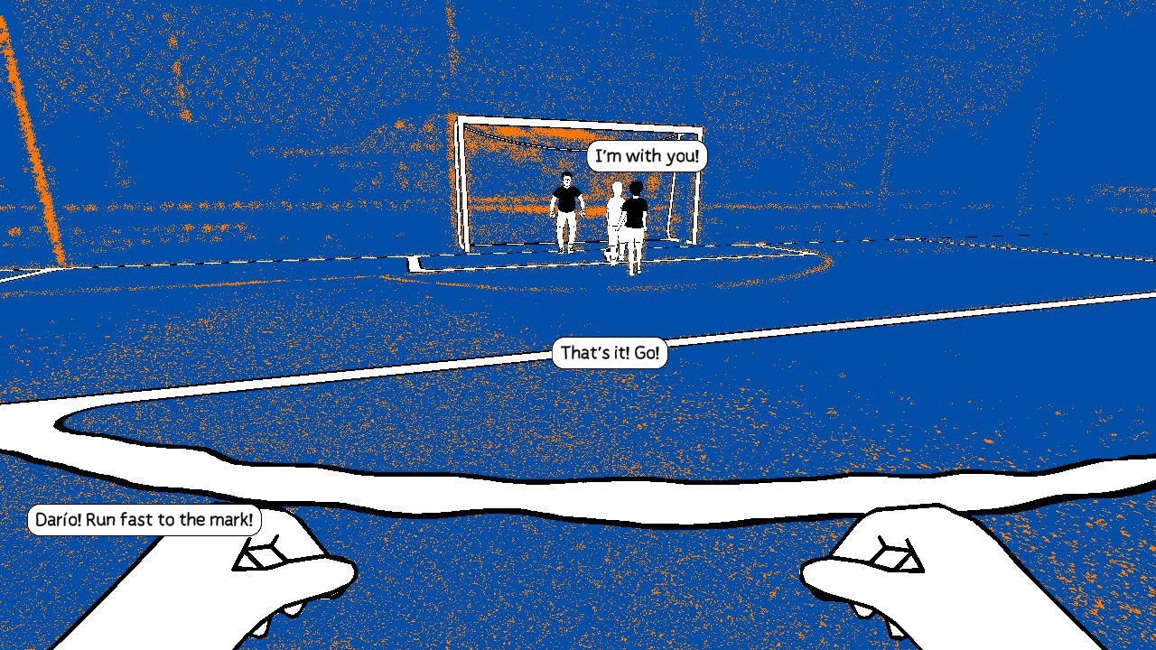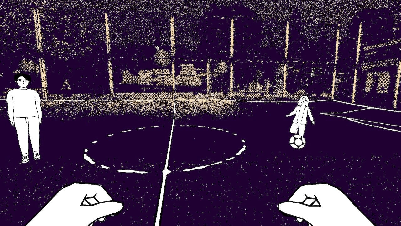 Gameplay-wise, this is all delivered in a variety of ways. That opening moment of playing on the console gives you a top-down, black-and-white football game, controlled with an innovative two-stick arrangement. The game then moves into first person, your “real-world” playtime football-kicking coming to mirror the console game’s controls. From this perspective, you sit in class, check your watch, skip school, talk to your friends, and, yes, kick around a football.